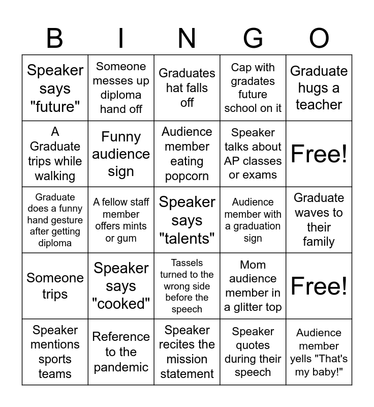 This bingo card has 50 words: Reference to the pandemic, Speaker says "talents", Someone tears up, Speaker recites the mission statement, Speaker says "cooked", Groups walk at different pace/get up at different times, Someone messes up diploma hand off, Speaker rhymes, A Graduate trips while walking, Speaker asks audience not to cheer, Funny audience sign, Cap with gradates future school on it, Free!, Mom audience member in a glitter top, Graduate wearing flip flops, Graduate struggling to walk in heels, Audience member eating popcorn, Audience member with a graduation sign, Graduate high fives a teacher, Graduate hugs a teacher, A fellow staff member offers mints or gum, Speaker quotes during their speech, Speaker says "future", Speaker talks about AP classes or exams, You know a staff member who sneaks out early, Audience member yells "That's my baby!", Free!, Graduates toss hats in the air, Graduates hat falls off, Tassels turned to the wrong side before the speech, Chorus performs, Graduate high fives a teacher, Old teacher haven't seen in a while show up, Graduate struggling to walk in heels, Reference to the pandemic, Speaker says "cluster", Covid is mechioned, School Board is mention, Mr. T shows up, Graduate waves to their family, Teachers are recognized by the speaker, Speaker references college, Speaker says cords, Speaker mentions clubs, Speaker mentions sports teams, Graduate does a funny hand gesture after getting diploma, Graduate dances after getting diploma, Speaker asks audience not to cheer, Someone trips and Speaker says "future".
