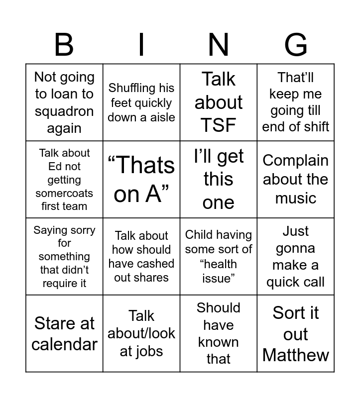 This bingo card has 17 words: Should have known that, Stare at calendar, Talk about TSF, Not going to loan to squadron again, Talk about how should have cashed out shares, That’ll keep me going till end of shift, Just gonna make a quick call, I’ll get this one, Complain about the music, “Thats on A”, Talk about/look at jobs, Child having some sort of “health issue”, Talk about Ed not getting somercoats first team, Shuffling his feet quickly down a aisle, Saying sorry for something that didn’t require it, Moaning about YouTubers (not talented) and Sort it out Matthew.