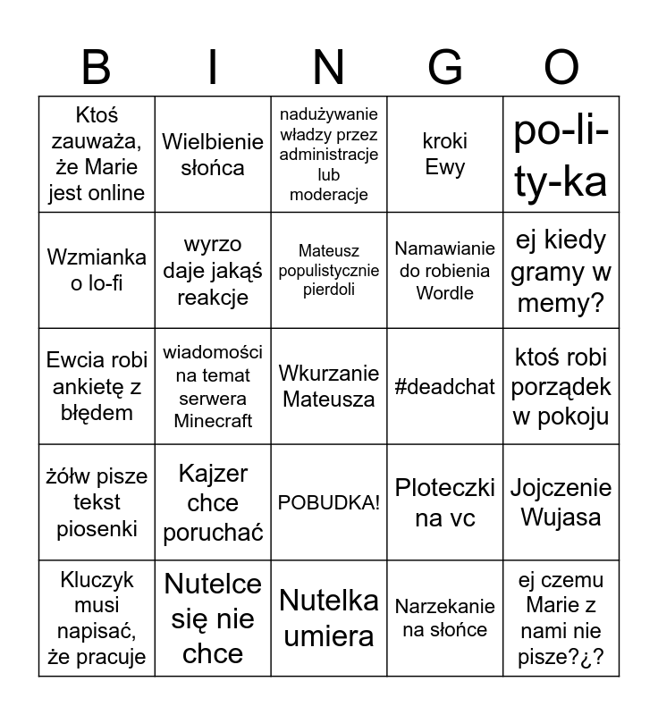 This bingo card has a free space and 24 words: Kajzer chce poruchać, Nutelce się nie chce, Mateusz populistycznie pierdoli, Kluczyk musi napisać, że pracuje, po-li-ty-ka, Ktoś zauważa, że Marie jest online, Wzmianka o lo-fi, Wielbienie słońca, #deadchat, POBUDKA!, Namawianie do robienia Wordle, Ewcia robi ankietę z błędem, Ploteczki na vc, Jojczenie Wujasa, wyrzo daje jakąś reakcje, Narzekanie na słońce, ktoś robi porządek w pokoju, nadużywanie władzy przez administracje lub moderacje, ej kiedy gramy w memy?, wiadomości na temat serwera Minecraft, ej czemu Marie z nami nie pisze?¿?, żółw pisze tekst piosenki, kroki Ewy and Nutelka umiera.