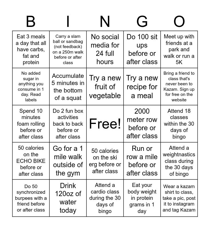 This bingo card has a free space and 24 words: Go for a 1 mile walk outside of the gym, Drink 120oz of water today, Try a new fruit of vegetable, Do 50 synchronized burpees with a friend before or after class, Meet up with friends at a park and walk or run a 5K, Eat 3 meals a day that all have carbs, fat and protein, No added sugar in anything you consume in 1 day. Read labels, Carry a slam ball or sandbag (not feedback) on a 250m walk before or after class, 2000 meter row before or after class, 50 calories on the ski erg before or after class, Try a new recipe for a meal, Spend 10 minutes foam rolling before or after class, Run or row a mile before or after class, Attend a weightnastics class during the 30 days of bingo, Accumulate 5 minutes in the bottom of a squat, Eat your body weight in protein grams in 1 day, Attend 18 classes within the 30 days of bingo, No social media for 24 full hours, Bring a friend to class that's never been to Kazam. Sign up for free on the website, Do 2 fun box activities back to back before or after class, Wear a kazam shirt to class, take a pic, post it to instagram and tag Kazam, 50 calories on the ECHO BIKE before or after class, Do 100 sit ups before or after class and Attend a cardio class during the 30 days of bingo.