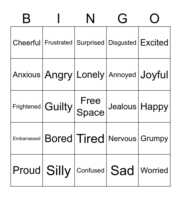 This bingo card has a free space and 24 words: Bored, Silly, Lonely, Proud, Excited, Cheerful, Anxious, Frustrated, Jealous, Tired, Annoyed, Frightened, Nervous, Grumpy, Angry, Sad, Happy, Surprised, Joyful, Guilty, Worried, Embarrassed, Disgusted and Confused.