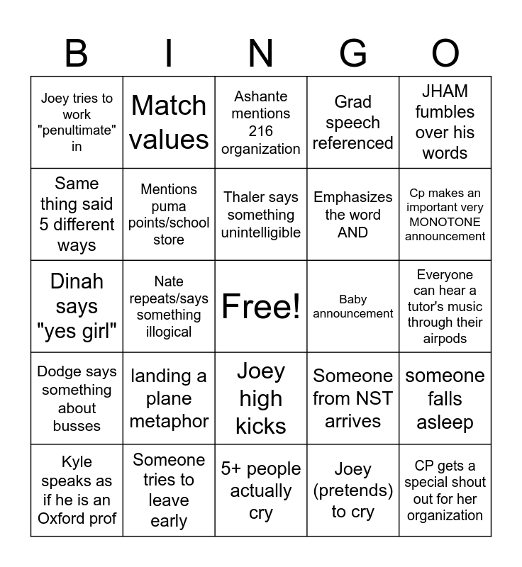 This bingo card has a free space and 26 words: Joey high kicks, Joey (pretends) to cry, Thaler says something unintelligible, Someone tries to leave early, JHAM fumbles over his words, Joey tries to work "penultimate" in, Same thing said 5 different ways, Match values, Everyone can hear a tutor's music through their airpods, Someone from NST arrives, Emphasizes the word AND, Dinah says "yes girl", someone falls asleep, Kyle speaks as if he is an Oxford prof, Nate repeats/says something illogical, Someone speaks with their mouth full, Grad speech referenced, Dodge says something about busses, Ashante mentions 216 organization, CP gets a special shout out for her organization, Cp makes an important very MONOTONE announcement, 5+ people actually cry, Baby announcement, landing a plane metaphor, Mentions puma points/school store and Passive aggressive comment about people returning.