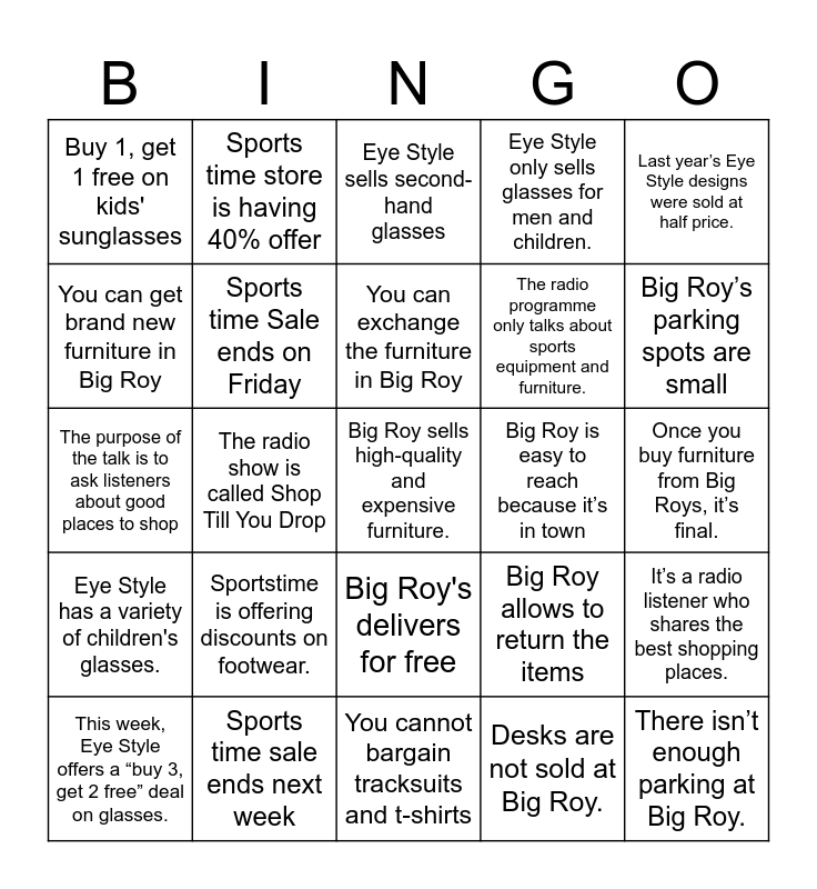 This bingo card has a free space and 24 words: Sportstime is offering discounts on footwear., Sports time sale ends next week, You can exchange the furniture in Big Roy, This week, Eye Style offers a “buy 3, get 2 free” deal on glasses., Last year’s Eye Style designs were sold at half price., Buy 1, get 1 free on kids' sunglasses, You can get brand new furniture in Big Roy, Sports time store is having 40% offer, Big Roy is easy to reach because it’s in town, Big Roy's delivers for free, The radio programme only talks about sports equipment and furniture., The purpose of the talk is to ask listeners about good places to shop, Big Roy allows to return the items, It’s a radio listener who shares the best shopping places., Sports time Sale ends on Friday, Desks are not sold at Big Roy., Once you buy furniture from Big Roys, it’s final., Eye Style sells second-hand glasses, Big Roy’s parking spots are small, The radio show is called Shop Till You Drop, There isn’t enough parking at Big Roy., Eye Style has a variety of children's glasses., Eye Style only sells glasses for men and children. and You cannot bargain tracksuits and t-shirts.
