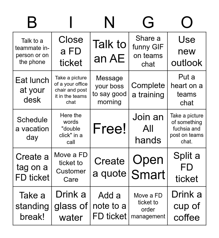 This bingo card has a free space and 28 words: Split a FD ticket, Join a teams meeting, Complete a training, Move a FD ticket to order management, Eat lunch at your desk, Talk to an AE, Close a FD ticket, Create a tag on a FD ticket, Join an All hands, Take a standing break!, Schedule a vacation day, Share a funny GIF on teams chat, Drink a glass of water, Add a note to a FD ticket, Put a heart on a teams chat, Respond to a client email, Move a FD ticket to Customer Care, Take a picture of a your office chair and post it in the teams chat, Message your boss to say good morning, Create a quote, Talk to a teammate in-person or on the phone, Accept a meeting invitation, Drink a cup of coffee, Here the words "double click" in a call, Take a picture of something fuchsia and post on teams chat., Open Smart, Use new outlook and Eat a snack.