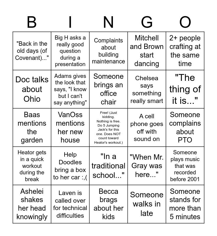 This bingo card has a free space and 34 words: Mr. R mentions his cottage, Someone walks in late, Someone asks a question that's already been answered, Mrs. B smiles, Heator gets in a quick workout during the break, Adams gives the look that says, "I know but I can't say anything", 2+ people crafting at the same time, Ashelei shakes her head knowingly, Big H asks a really good question during a presentation, 2+ people are accidentally matching clothes, Someone brings an office chair, Complaints about building maintenance, A side conversation lasts longer than 5 minutes, Weiss growls, A cell phone goes off with sound on, "The thing of it is...", Laven is called over for technical difficulties, Baas mentions the garden, Help Doodles bring a box to her car :,(, "When Mr. Gray was here...", "In a traditional school...", Someone shares an innapropriate joke, "Back in the old days (of Covenant)...", Someone complains about PTO, Becca brags about her kids, Someone stands for more than 5 minutes, Mitchell and Brown start dancing, Walker offers her Cricut services, Chelsea says something really smart, Doc talks about Ohio, Ms. Guzman looks fabulous, VanOss mentions her new house, Someone plays music that was recorded before 2001 and You get a text from a student.