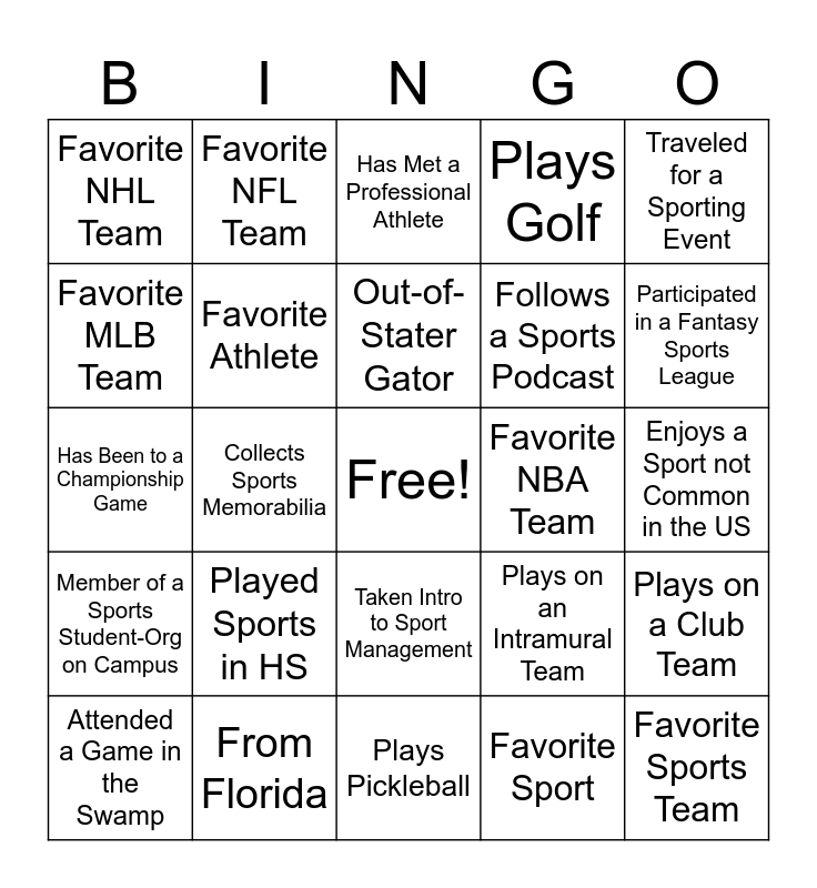 This bingo card has a free space and 24 words: Played Sports in HS, From Florida, Out-of-Stater Gator, Attended a Game in the Swamp, Traveled for a Sporting Event, Favorite NHL Team, Favorite MLB Team, Favorite NFL Team, Favorite NBA Team, Taken Intro to Sport Management, Follows a Sports Podcast, Has Been to a Championship Game, Plays on an Intramural Team, Plays on a Club Team, Favorite Athlete, Favorite Sport, Enjoys a Sport not Common in the US, Has Met a Professional Athlete, Participated in a Fantasy Sports League, Collects Sports Memorabilia, Favorite Sports Team, Member of a Sports Student-Org on Campus, Plays Golf and Plays Pickleball.