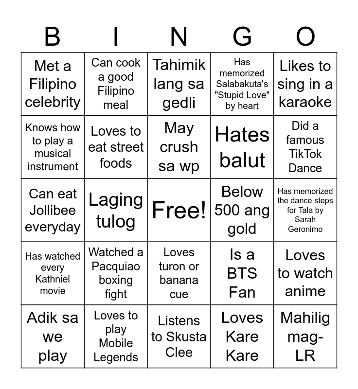 This bingo card has a free space and 24 words: Adik sa we play, Watched a Pacquiao boxing fight, May crush sa wp, Loves Kare Kare, Likes to sing in a karaoke, Met a Filipino celebrity, Can cook a good Filipino meal, Tahimik lang sa gedli, Below 500 ang gold, Has memorized the dance steps for Tala by Sarah Geronimo, Can eat Jollibee everyday, Loves to eat street foods, Is a BTS Fan, Loves to watch anime, Knows how to play a musical instrument, Loves to play Mobile Legends, Listens to Skusta Clee, Has memorized Salabakuta's "Stupid Love" by heart, Did a famous TikTok Dance, Has watched every Kathniel movie, Laging tulog, Loves turon or banana cue, Hates balut and Mahilig mag-LR.