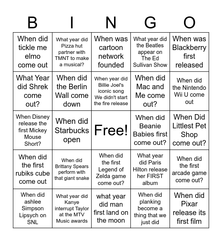 This bingo card has a free space and 56 words: When Did Mattel release the first barbie doll?, When did ashlee Simpson Lipsych on SNL, When did the first pokemon game come out, When did tickle me elmo come out, what year did man first land on the moon, What year did the Mayan calendar end, When did the Berlin Wall come down, When was Bbbingo established, When did Mac and Me come out?, What year did Star Wars come out?, What year did the Beatles appear on The Ed Sullivan Show, When Did the first Mario game come out, What year did Pokemon Go come out, When was the first Bratz doll released, When did Brittany Spears debut, What year were woman able to open bank accounts independently (in the us), When was Blackberry first released, When did Starbucks open, When was the Watergate scandal?, When did Pixar release its first film, When did Beanie Babies first come out?, When did Razr Phones come out, What year did Paris Hilton release her FIRST album, When was cartoon network founded, When did the first Kidzbop come out, When year did Billie Joel's iconic song We didn't start the fire release, When did the first easy bake oven release, When did the first automobile come out, When did the Nintendo Wii U come out, When did the PlayStation 2 come out, What year did the first ren faire happen, When did My Little Pony come out?, When did the first reality tv show come out?, What did frozen come out?, When Did Littlest Pet Shop come out?, What Year did Shrek come out?, When Disney release the first Mickey Mouse Short?, When did the first Ipod come out?, When did the first rubiks cube come out, What year did Pizza hut partner with TMNT to make a musical?, When did the first Legend of Zelda game come out?, when did the first self driving care release, What year were there 3 rival popes?, When did Nirvana release their first song, When did the first Animal Crossing come out?, When did Brittany Spears perform with that giant snake, What year did Kanye interrupt Taylor at the MTV Music awards, When did Jersey Shore release, when did the Hipster trend come on the scene?, When did Razor scooters first hit the streets?, When did planking become a thing that we just did, When was dabbing popular, When did vine shut down, when did facebook release to the public, When did the first arcade game come out? and When did the video game crash happen?.