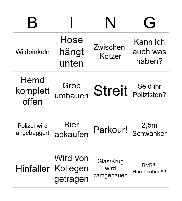 This bingo card has 16 words: Wird von Kollegen getragen, 2,5m Schwanker, Zwischen-Kotzer, Wildpinkeln, Polizei wird angebaggert, Hose hängt unten, Parkour!, Glas/Krug wird zamgehauen, Hemd komplett offen, Grob umhauen, Hinfaller, Kann ich auch was haben?, Bier abkaufen, Seid ihr Polizisten?, Streit and BVB!!! Hurensöhne!!!!.