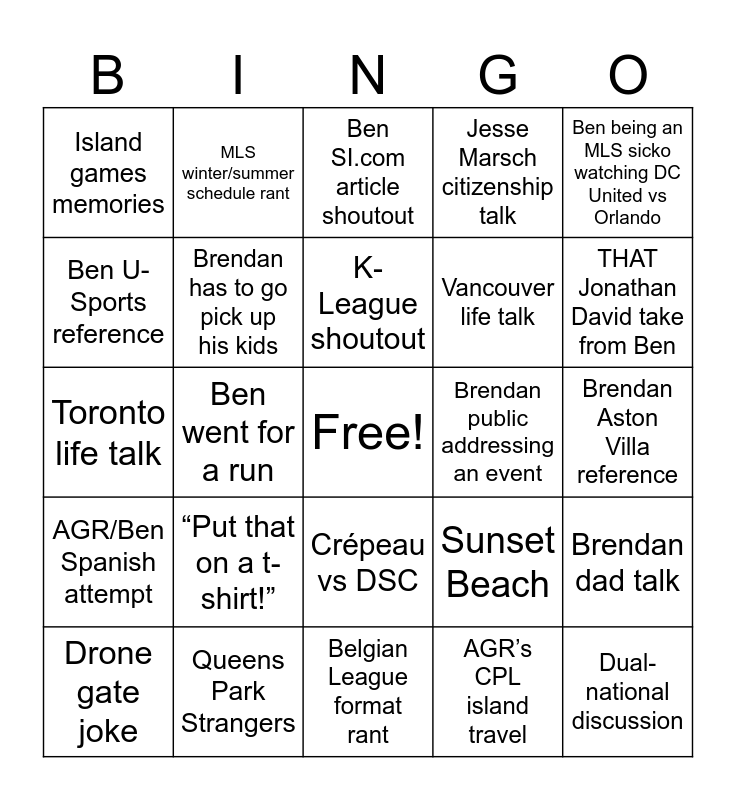 This bingo card has a free space and 24 words: “Put that on a t-shirt!”, Queens Park Strangers, K-League shoutout, Drone gate joke, Ben being an MLS sicko watching DC United vs Orlando, Island games memories, Ben U-Sports reference, MLS winter/summer schedule rant, Brendan public addressing an event, Crépeau vs DSC, Vancouver life talk, Toronto life talk, Sunset Beach, Brendan dad talk, Brendan has to go pick up his kids, AGR’s CPL island travel, Brendan Aston Villa reference, Ben SI.com article shoutout, THAT Jonathan David take from Ben, Ben went for a run, Dual-national discussion, AGR/Ben Spanish attempt, Jesse Marsch citizenship talk and Belgian League format rant.