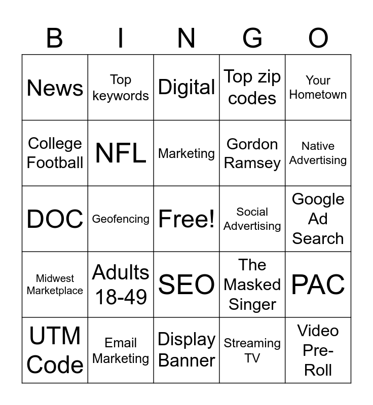 This bingo card has a free space and 29 words: UTM Code, Keyword Targeting, Geofencing, IP Targeting, News, Digital, NFL, Adults 18-49, Social Advertising, Email Marketing, Google Ad Search, Video Pre-Roll, Display Banner, Streaming TV, Native Advertising, Foot Traffic Conversions, SEO, Midwest Marketplace, Your Hometown, DOC, The Masked Singer, The Floor, Gordon Ramsey, College Football, Top zip codes, Top keywords, PAC, Marketing and Marketing Consultant.