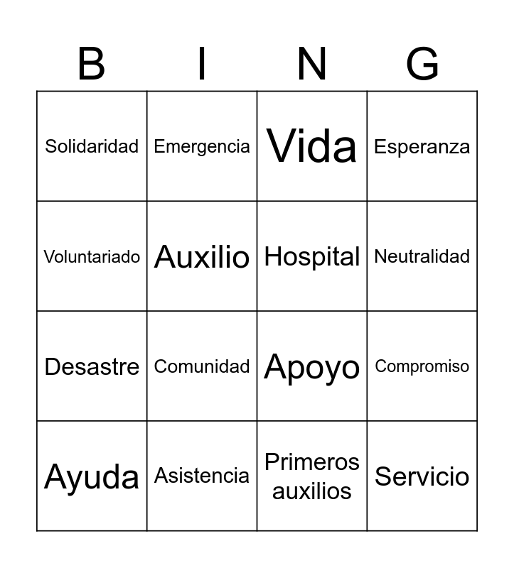 This bingo card has 26 words: Free!, Humanidad, Neutralidad, Imparcialidad, Voluntariado, Solidaridad, Auxilio, Emergencia, Primeros auxilios, Rescate, Desastre, Apoyo, Salud, Protección, Compromiso, Donación, Esperanza, Servicio, Vida, Ayuda, Comunidad, Prevención, Asistencia, Crisis, Hospital and Sangre.