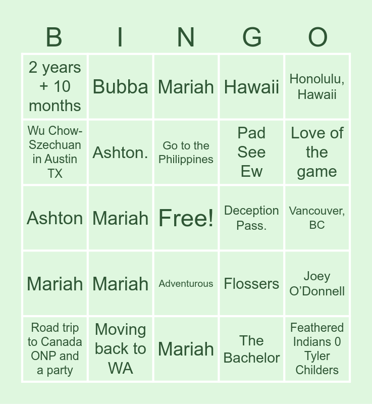 This bingo card has a free space and 84 words: Law school., Her phone., Mariah, Drive-in movie theater, 3 years and 9 months, Mariah’s apartment, Shy by leon Bridges, Mariah, Venom: Let There be Carnage, drive-in movie., Mariah: That he has beautiful eyes, very handsome, and seemed smart and down-to-earth., Ashton: That she was very beautiful, super friendly, and had very nice calves., Ashton., Deception Pass., Cheryl Robinson and Amber, 2 years + 10 months, Road trip to Canada ONP and a party, Wu Chow-Szechuan in Austin TX, Lord of the Rings, New Zealand, Better Call Saul, Pad See Ew, Feathered Indians 0 Tyler Childers, Christmas, Mariah, Hike, Mariah’s a baby, Mariah, Mariah, Ashton, Mariah, Ashton, Mariah, Ashton, Mariah, Mariah, Mariah, Tough, Love of the game, Mariah, Movie theater, Ash stuffs his mouth with food, Gum makes Mariah sneeze, Basketball, Daniel Caesar, Improv comedy, Bubba, Bubba, Ash joining the military / long distance, 2 months, Austin & San Antonio, Flossers, Hawaii, Kids, Dog, Cabin-like, Moving back to WA, Go to the Philippines, Volunteering, Vancouver, BC, Washington, Not working on Sunday, Pay off Law School debt 2x!, Mariah, Mariah, Ashton, Sage Green, Mariah, Honolulu, Hawaii, Mariah, Joey O’Donnell, Mr. Brightside - The Killers, Say it Ain’t So - Weezer, Collect vinyl records, Adventurous, The Bachelor, Ashton, Ashton, Mariah, Proposal at Deception Pass, Finding Joy in the mundane small things, His patience, Being a family and Our first Kiss.