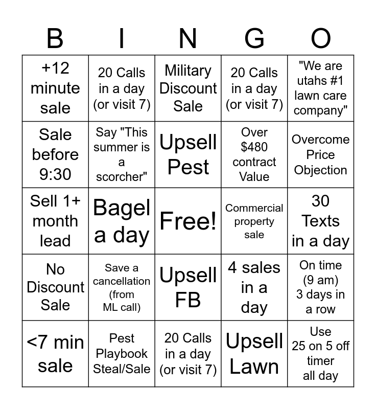 This bingo card has a free space and 26 words: Upsell FB, Upsell Lawn, Upsell Pest, Pest Playbook Steal/Sale, "We are utahs #1 lawn care company", +12 minute sale, Sale before 9:30, 20 Calls in a day (or visit 7), 30 Texts in a day, 4 sales in a day, Over $480 contract Value, Sell 1+ month lead, On time (9 am) 3 days in a row, <7 min sale, Bagel a day, CSA call while on a call, 20 Calls in a day (or visit 7), No Discount Sale, Military Discount Sale, Use 25 on 5 off timer all day, Overcome Price Objection, 20 Calls in a day (or visit 7), Commercial property sale, Save a cancellation (from ML call), Say "This summer is a scorcher" and Get a medical issue describe to you.