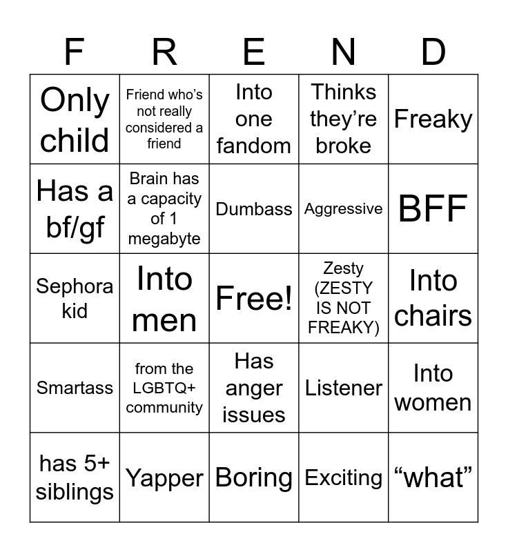 This bingo card has a free space and 24 words: from the LGBTQ+ community, Yapper, Dumbass, has 5+ siblings, Freaky, Only child, Has a bf/gf, Friend who’s not really considered a friend, Zesty (ZESTY IS NOT FREAKY), Has anger issues, Aggressive, Sephora kid, Listener, Into women, Brain has a capacity of 1 megabyte, Exciting, Into chairs, Into one fandom, BFF, Into men, “what”, Smartass, Thinks they’re broke and Boring.