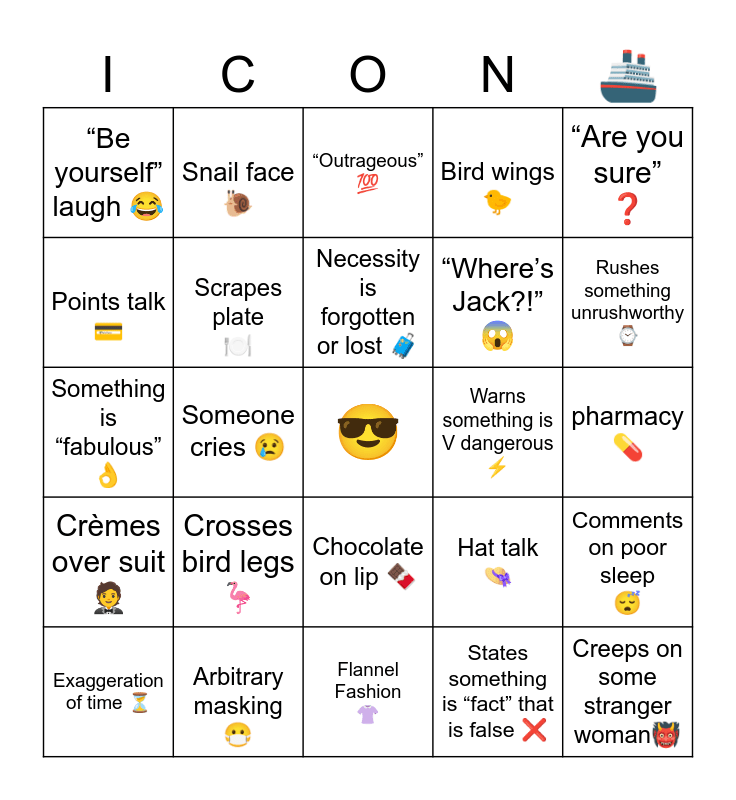 This bingo card has a free space and 24 words: Crosses bird legs 🦩, Arbitrary masking 😷, Necessity is forgotten or lost 🧳, Exaggeration of time ⏳, “Are you sure” ❓, “Be yourself” laugh 😂, Points talk 💳, Snail face 🐌, Warns something is V dangerous ⚡, Chocolate on lip 🍫, “Where’s Jack?!” 😱, Something is “fabulous” 👌, Hat talk 👒, Comments on poor sleep 😴, Scrapes plate 🍽, States something is “fact” that is false ❌, pharmacy 💊, “Outrageous” 💯, Rushes something unrushworthy ⌚, Someone cries 😢, Creeps on some stranger woman👹, Crèmes over suit 🤵, Bird wings 🐤 and Flannel Fashion 👚.