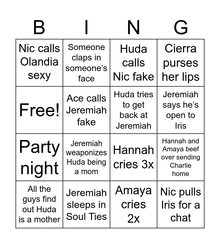 This bingo card has 16 words: Jeremiah sleeps in Soul Ties, Hannah and Amaya beef over sending Charlie home, Huda calls Nic fake, Nic calls Olandia sexy, Party night, Someone claps in someone’s face, Hannah cries 3x, Amaya cries 2x, Free!, Ace calls Jeremiah fake, All the guys find out Huda is a mother, Cierra purses her lips, Jeremiah weaponizes Huda being a mom, Jeremiah says he’s open to Iris, Huda tries to get back at Jeremiah and Nic pulls Iris for a chat.