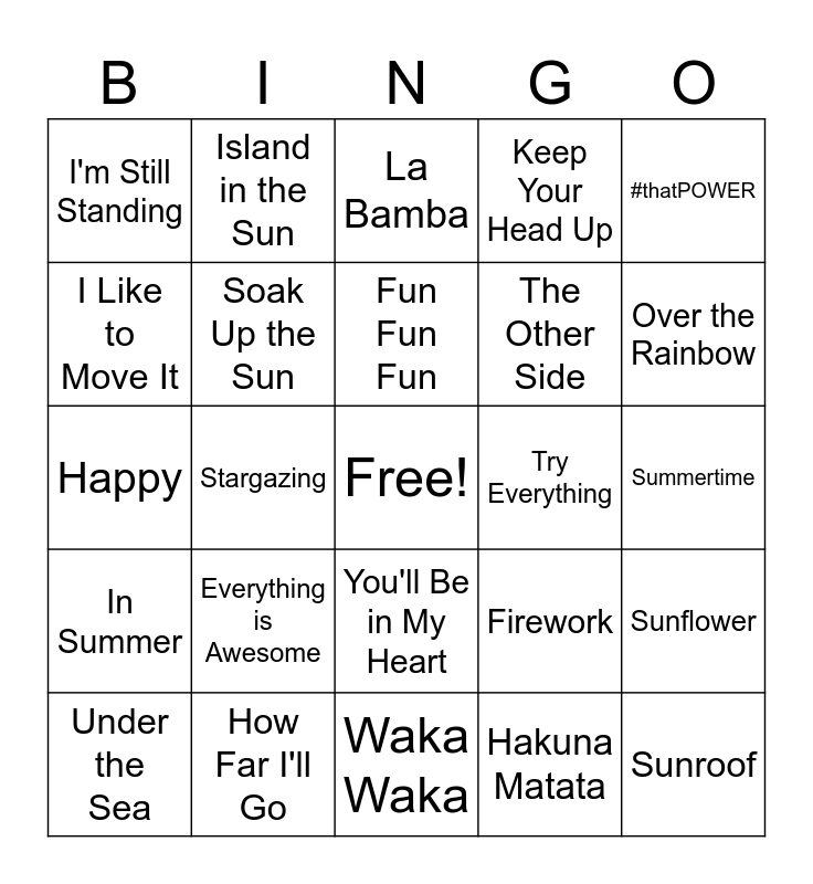 This bingo card has a free space and 24 words: Everything is Awesome, How Far I'll Go, Fun Fun Fun, Under the Sea, #thatPOWER, I'm Still Standing, I Like to Move It, Island in the Sun, Try Everything, You'll Be in My Heart, The Other Side, Happy, Firework, Sunflower, Soak Up the Sun, Hakuna Matata, Summertime, La Bamba, Over the Rainbow, Stargazing, Sunroof, In Summer, Keep Your Head Up and Waka Waka.