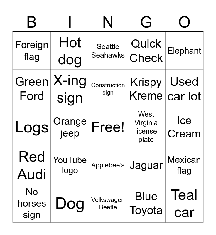 This bingo card has a free space and 26 words: Applebee’s, Blue Toyota, Construction sign, Dog, Elephant, Foreign flag, Green Ford, Hot dog, Ice Cream, Jaguar, Krispy Kreme, Logs, Mexican flag, No horses sign, Orange jeep, Prius, Quick Check, Red Audi, Seattle Seahawks, Teal car, Used car lot, Volkswagen Beetle, West Virginia license plate, YouTube logo, X-ing sign and Zoo.