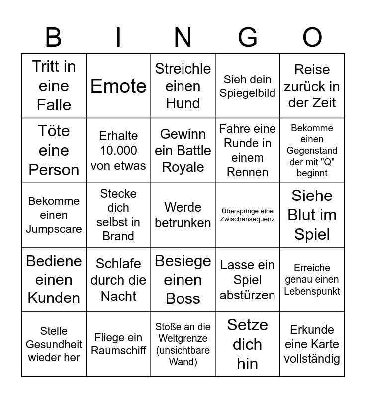 This bingo card has a free space and 24 words: Schlafe durch die Nacht, Fliege ein Raumschiff, Gewinn ein Battle Royale, Stelle Gesundheit wieder her, Reise zurück in der Zeit, Tritt in eine Falle, Töte eine Person, Emote, Überspringe eine Zwischensequenz, Besiege einen Boss, Fahre eine Runde in einem Rennen, Bekomme einen Jumpscare, Lasse ein Spiel abstürzen, Erreiche genau einen Lebenspunkt, Erhalte 10.000 von etwas, Setze dich hin, Siehe Blut im Spiel, Streichle einen Hund, Bekomme einen Gegenstand der mit "Q" beginnt, Stecke dich selbst in Brand, Erkunde eine Karte vollständig, Bediene einen Kunden, Sieh dein Spiegelbild and Stoße an die Weltgrenze (unsichtbare Wand).