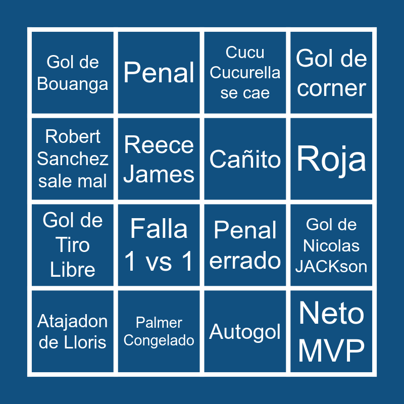 This bingo card has 16 words: Palmer Congelado, Gol de Nicolas JACKson, Cucu Cucurella se cae, Gol de Bouanga, Gol de Tiro Libre, Penal, Penal errado, Autogol, Robert Sanchez sale mal, Reece James, Atajadon de Lloris, Gol de corner, Falla 1 vs 1, Roja, Cañito and Neto MVP.