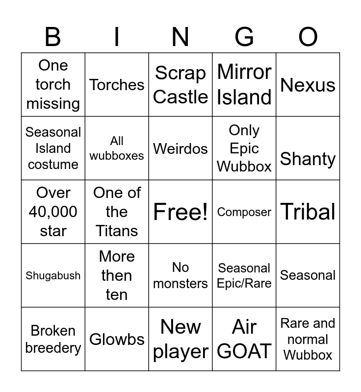 This bingo card has a free space and 24 words: Broken breedery, More then ten, Weirdos, Air GOAT, Nexus, One torch missing, Torches, Scrap Castle, Composer, Tribal, Over 40,000 star, All wubboxes, Seasonal Epic/Rare, Seasonal, Seasonal Island costume, Glowbs, New player, Mirror Island, Shanty, Shugabush, One of the Titans, No monsters, Only Epic Wubbox and Rare and normal Wubbox.
