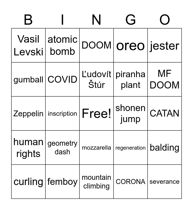 This bingo card has a free space and 24 words: geometry dash, femboy, Ľudovít Štúr, curling, jester, Vasil Levski, gumball, atomic bomb, shonen jump, mozzarella, piranha plant, Zeppelin, regeneration, balding, COVID, CORONA, CATAN, DOOM, MF DOOM, inscription, severance, human rights, oreo and mountain climbing.