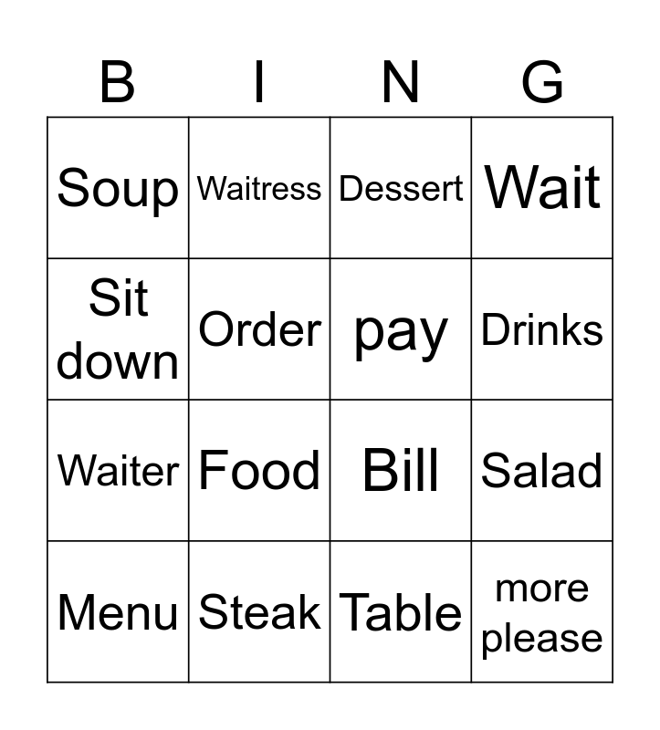 This bingo card has 16 words: Steak, Salad, Dessert, Soup, Waiter, Waitress, Bill, Table, Sit down, Order, Menu, Wait, Food, Drinks, pay and more please.