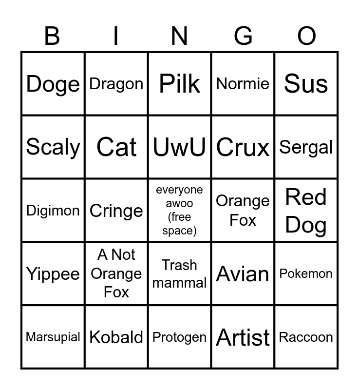 This bingo card has a free space and 39 words: Blue Dog, Another Blue Dog, 3 Blue Dogs, Cat, Marsupial, Trash mammal, UwU, OwO, Sus, Yippee, Cringe, Normie, Raccoon, Red Dog, Orange Fox, A Not Orange Fox, Sparkle Dog, Doge, Awoo, Avian, Scaly, Protogen, Crux, Sergal, Dutch Angel Dragon, Synth, Plush Toy, Badge, Manokit, Dragon, I.T. Employee, Conventions, Pilk, Kobald, Artist, Con-Goer, Pokemon, Digimon and Grey Muzzle.