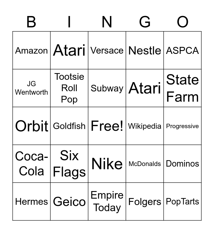 This bingo card has a free space and 24 words: Six Flags, Geico, Subway, Hermes, ASPCA, Amazon, JG Wentworth, Atari, Wikipedia, Nike, Atari, Orbit, McDonalds, Dominos, Tootsie Roll Pop, Folgers, Progressive, Versace, State Farm, Goldfish, PopTarts, Coca-Cola, Nestle and Empire Today.