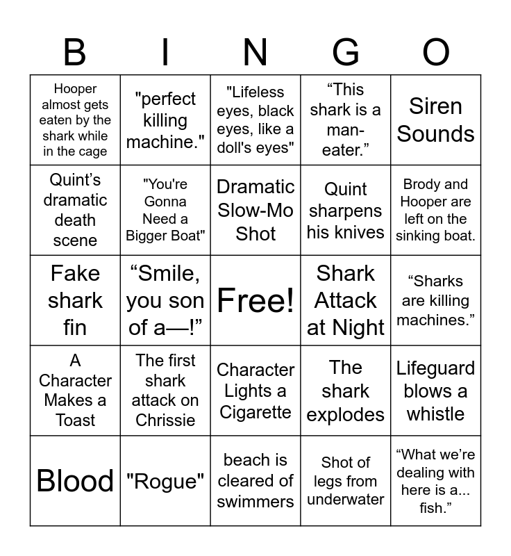 This bingo card has a free space and 39 words: Dorsal Fin Above Water, Theme Music is Played, Gunfire, "You're Gonna Need a Bigger Boat", Blood, Character Lights a Cigarette, Dramatic Slow-Mo Shot, Someone Falls in Water Unexpectedly, Siren Sounds, A Character Makes a Toast, “Smile, you son of a—!”, “This shark is a man-eater.”, “What we’re dealing with here is a... fish.”, “Sharks are killing machines.”, Shark Attack at Night, The first shark attack on Chrissie, Quint’s "U.S.S. Indianapolis" monologue, Hooper almost gets eaten by the shark while in the cage, Shark jumps out of the water right next to the boat, The shark explodes, Quint’s dramatic death scene, beach is cleared of swimmers, Quint sharpens his knives, Brody and Hooper are left on the sinking boat., camera zooms in on the shark’s eye, Quint nails a fishhook into the boat, shark is going after the boat’s fuel supply., Brody finds the fisherman's body, Hooper finds massive shark’s teeth, "perfect killing machine.", Chum in the water, Mayor finally closes beaches, "Lifeless eyes, black eyes, like a doll's eyes", "Rogue", Shot of legs from underwater, "SHARK!", Lifeguard blows a whistle, Fake shark fin and Leg falls to the bottom of the lagoon.