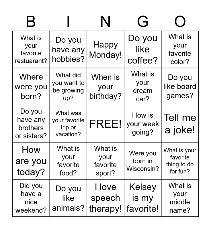 This bingo card has a free space and 24 words: What is your favorite food?, Do you like animals?, When is your birthday?, Did you have a nice weekend?, What is your favorite color?, What is your favorite restuarant?, Where were you born?, Do you have any hobbies?, How is your week going?, What is your favorite sport?, What is your dream car?, Do you have any brothers or sisters?, Were you born in Wisconsin?, What is your favorite thing to do for fun?, What did you want to be growing up?, Kelsey is my favorite!, Tell me a joke!, Happy Monday!, Do you like board games?, What was your favorite trip or vacation?, What is your middle name?, How are you today?, Do you like coffee? and I love speech therapy!.