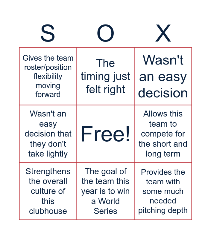 This bingo card has a free space and 8 words: Allows this team to compete for the short and long term, Wasn't an easy decision, The timing just felt right, Strengthens the overall culture of this clubhouse, Gives the team roster/position flexibility moving forward, Provides the team with some much needed pitching depth, Wasn't an easy decision that they don't take lightly and The goal of the team this year is to win a World Series.