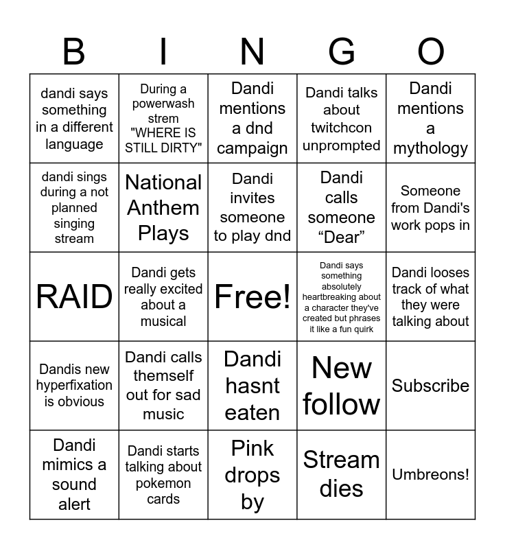 This bingo card has a free space and 24 words: Dandi calls themself out for sad music, Dandi starts talking about pokemon cards, Dandi invites someone to play dnd, Dandi mimics a sound alert, Dandi mentions a mythology, dandi says something in a different language, dandi sings during a not planned singing stream, During a powerwash strem "WHERE IS STILL DIRTY", Dandi says something absolutely heartbreaking about a character they've created but phrases it like a fun quirk, Dandi hasnt eaten, Dandi calls someone “Dear”, RAID, New follow, Subscribe, National Anthem Plays, Stream dies, Dandi looses track of what they were talking about, Dandi mentions a dnd campaign, Someone from Dandi's work pops in, Dandi gets really excited about a musical, Umbreons!, Dandis new hyperfixation is obvious, Dandi talks about twitchcon unprompted and Pink drops by.