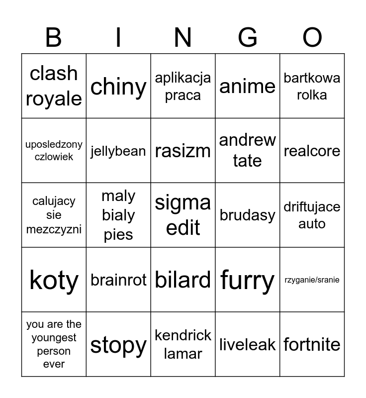 This bingo card has a free space and 24 words: you are the youngest person ever, brainrot, rasizm, liveleak, bartkowa rolka, clash royale, chiny, aplikacja praca, brudasy, driftujace auto, calujacy sie mezczyzni, jellybean, furry, rzyganie/sranie, uposledzony czlowiek, stopy, kendrick lamar, anime, realcore, koty, maly bialy pies, bilard, andrew tate and fortnite.