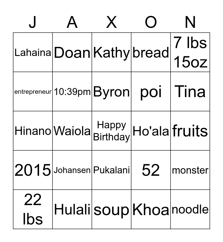 This bingo card has a free space and 34 words: Kaleihulu, Khoa, DeLima, Oct 29, 2015, 10:39pm, 7 lbs 15oz, 22 lbs, Doan, Pham, Byron, Kathy, Henry, LeeAnn, Ho'ala, Tina, Hulali, Hinano, Johansen, 52, Pukalani, 387, Lahaina, fruits, soup, noodle, bread, rice, poi, entrepreneur, ONE, Waiola, monster and Wailuku.