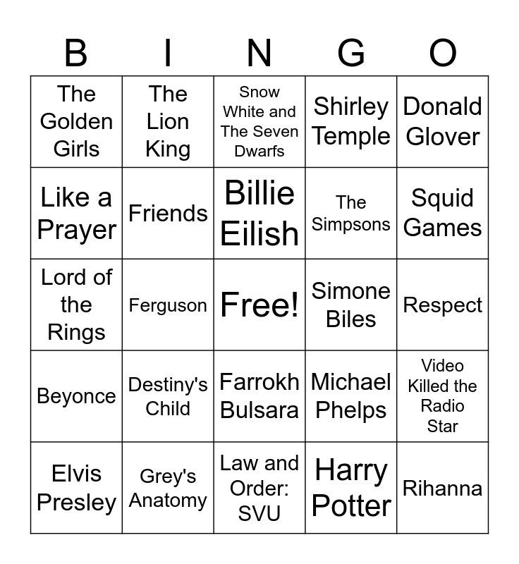 This bingo card has a free space and 24 words: Destiny's Child, Grey's Anatomy, Billie Eilish, Elvis Presley, Donald Glover, The Golden Girls, Like a Prayer, The Lion King, Simone Biles, Farrokh Bulsara, The Simpsons, Lord of the Rings, Michael Phelps, Video Killed the Radio Star, Friends, Harry Potter, Respect, Snow White and The Seven Dwarfs, Squid Games, Ferguson, Rihanna, Beyonce, Shirley Temple and Law and Order: SVU.