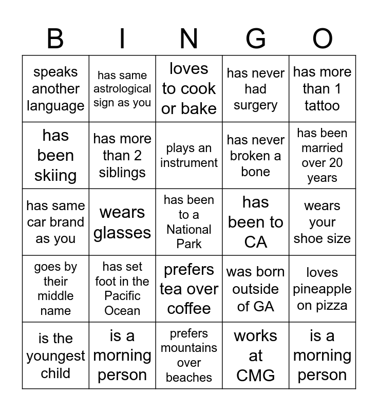 This bingo card has 30 words: is a morning person, has worn braces, wears glasses, is NOT on Facebook, speaks another language, loves to cook or bake, has more than 2 siblings, prefers tea over coffee, has been to CA, prefers mountains over beaches, wears your shoe size, has been to a National Park, works at CMG, is a morning person, has been married over 20 years, is taller than you, was born outside of GA, goes by their middle name, has set foot in the Pacific Ocean, has more than 1 tattoo, has same car brand as you, has a pet that is not a dog or cat, has same astrological sign as you, has never broken a bone, has been skiing, has never had surgery, loves pineapple on pizza, is the youngest child, plays an instrument and has never been to Disney.