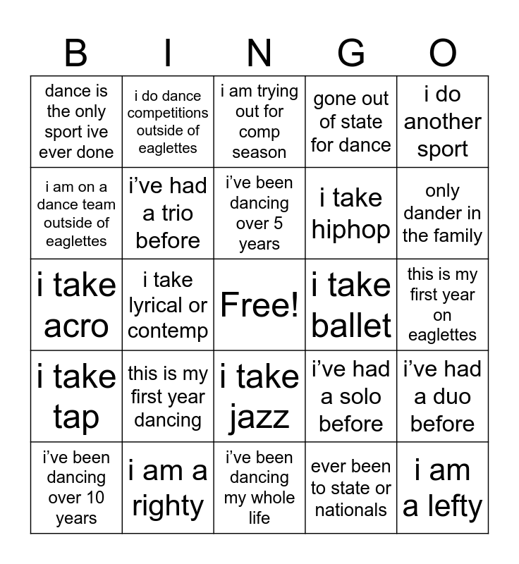 This bingo card has a free space and 25 words: this is my first year dancing, i’ve been dancing my whole life, i’ve been dancing over 5 years, i’ve been dancing over 10 years, i do another sport, dance is the only sport ive ever done, i am on a dance team outside of eaglettes, i do dance competitions outside of eaglettes, i take ballet, i take jazz, i take hiphop, i take acro, i’ve had a solo before, i’ve had a duo before, i’ve had a trio before, i’m an eaglette, this is my first year on eaglettes, i am trying out for comp season, only dander in the family, i take lyrical or contemp, i am a lefty, i am a righty, i take tap, gone out of state for dance and ever been to state or nationals.