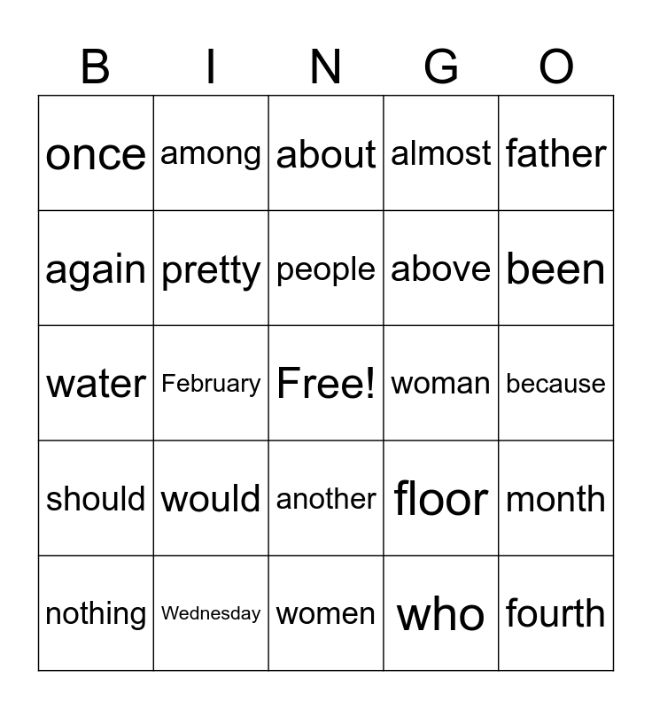 This bingo card has a free space and 30 words: Wednesday, Monday, February, friend, once, about, pretty, another, woman, women, because, fourth, who, does, been, forty, floor, should, would, father, water, today, among, above, again, almost, month, nothing, people and always.