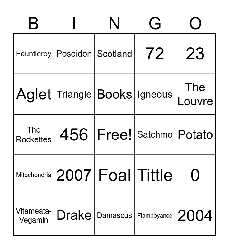 This bingo card has a free space and 24 words: 2007, Drake, Books, Vitameata- Vegamin, 23, Fauntleroy, Aglet, Poseidon, Satchmo, Foal, Igneous, The Rockettes, Tittle, 0, Triangle, Flamboyance, Potato, Scotland, The Louvre, 456, 2004, Mitochondria, 72 and Damascus.