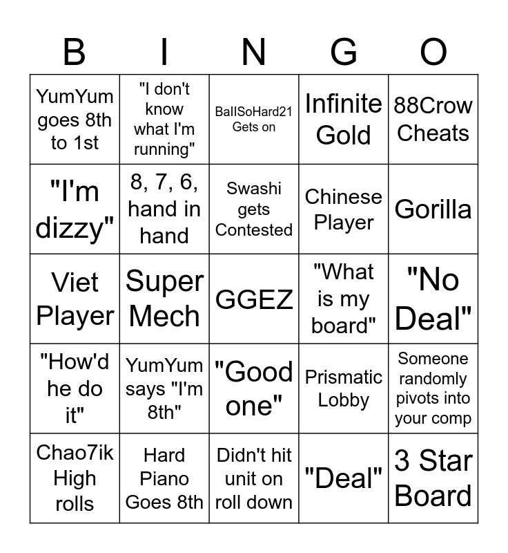This bingo card has a free space and 24 words: YumYum says "I'm 8th", Hard Piano Goes 8th, Swashi gets Contested, Chao7ik High rolls, 88Crow Cheats, YumYum goes 8th to 1st, "I'm dizzy", "I don't know what I'm running", "What is my board", "Good one", Chinese Player, Viet Player, Prismatic Lobby, Someone randomly pivots into your comp, 8, 7, 6, hand in hand, "Deal", "No Deal", BaIISoHard21 Gets on, Gorilla, Super Mech, 3 Star Board, "How'd he do it", Infinite Gold and Didn't hit unit on roll down.