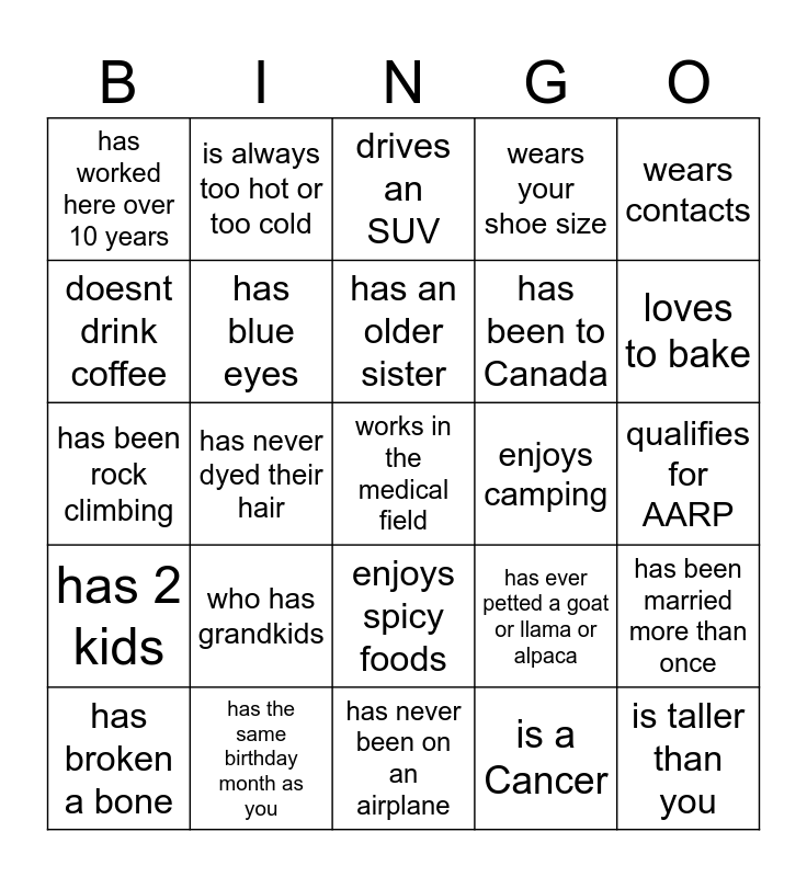 This bingo card has a free space and 24 words: who has grandkids, has the same birthday month as you, has an older sister, has broken a bone, wears contacts, has worked here over 10 years, doesnt drink coffee, is always too hot or too cold, enjoys camping, enjoys spicy foods, has been to Canada, has been rock climbing, has ever petted a goat or llama or alpaca, has been married more than once, has blue eyes, is a Cancer, qualifies for AARP, drives an SUV, loves to bake, has never dyed their hair, is taller than you, has 2 kids, wears your shoe size and has never been on an airplane.