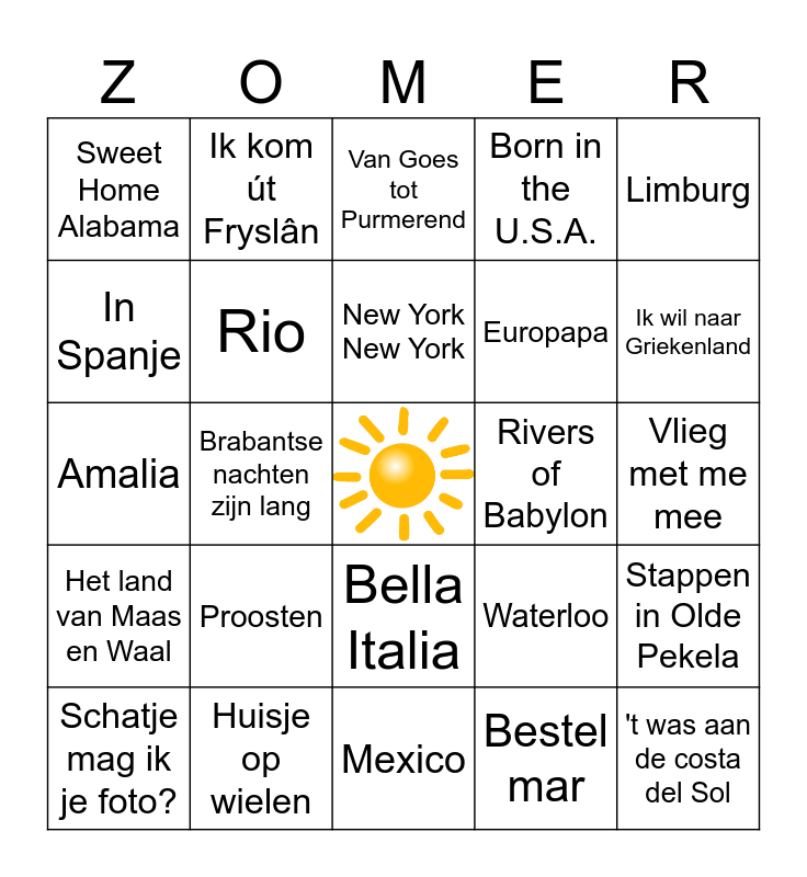 This bingo card has a free space and 47 words: Amarillo, 't was aan de costa del Sol, Hooray! Hooray! It's a holi-holiday, Mexico, Proosten, We're going to Ibiza!, Ik kom út Fryslân, Laat de zon in je hart, In Spanje, Vier zomers lang, Rio, Born in the U.S.A., Stappen in Olde Pekela, Waterloo, Viva Hollandia, Viva Las Vegas, New York New York, Rivers of Babylon, Surfin U.S.A., Limburg, Brabantse nachten zijn lang, Bestel mar, Sweet Home Alabama, Europapa, Ome Jan, Ik wil naar Griekenland, Schatje mag ik je foto?, Bij ons in de Jordaan, Bella Italia, Het land van Maas en Waal, Dreadlock Holiday, Take me home country roads, Op de tandem naar Marokko, Una Paloma Blanca, Summer of '69, Huisje op wielen, Vlieg met me mee, Walking on sunshine, Per spoor (kedeng kedeng), Met de vlam in de pijp, Zoet zout zuur, Van Goes tot Purmerend, Amalia, Terug in de tijd, Engel bewaarder, Het regent zonnestralen and Schulten brau.