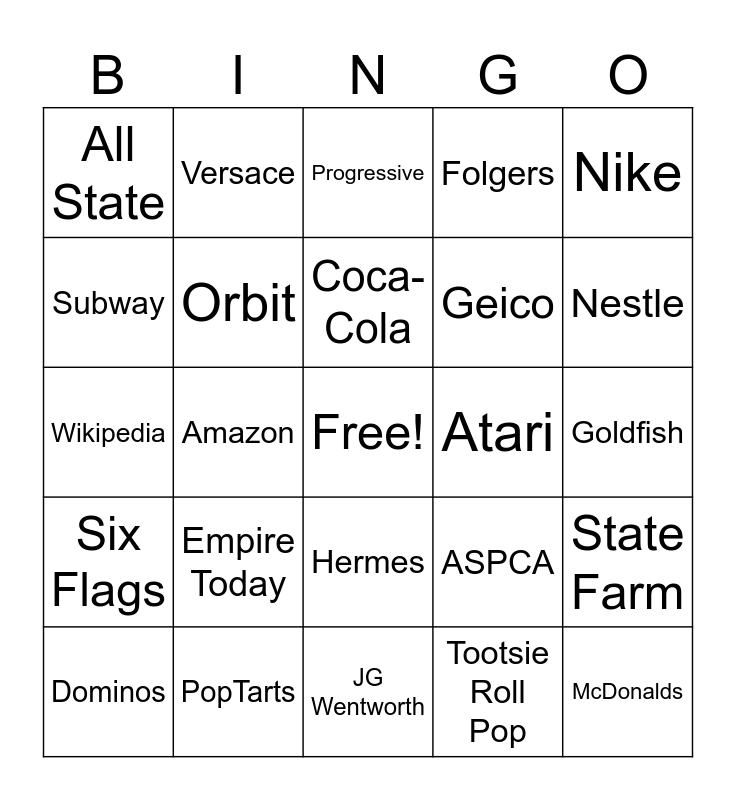 This bingo card has a free space and 24 words: Empire Today, PopTarts, Coca-Cola, Dominos, Nike, All State, Subway, Versace, Atari, Hermes, Geico, Wikipedia, ASPCA, State Farm, Orbit, Tootsie Roll Pop, Goldfish, Progressive, Nestle, Amazon, McDonalds, Six Flags, Folgers and JG Wentworth.