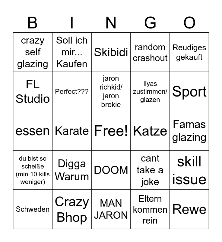 This bingo card has a free space and 24 words: Digga Warum, Crazy Bhop, jaron richkid/ jaron brokie, Schweden, Reudiges gekauft, crazy self glazing, FL Studio, Soll ich mir... Kaufen, Katze, DOOM, Ilyas zustimmen/ glazen, essen, cant take a joke, skill issue, Perfect???, Eltern kommen rein, Famas glazing, Skibidi, Sport, Karate, Rewe, du bist so scheiße (min 10 kills weniger), random crashout and MAN JARON.