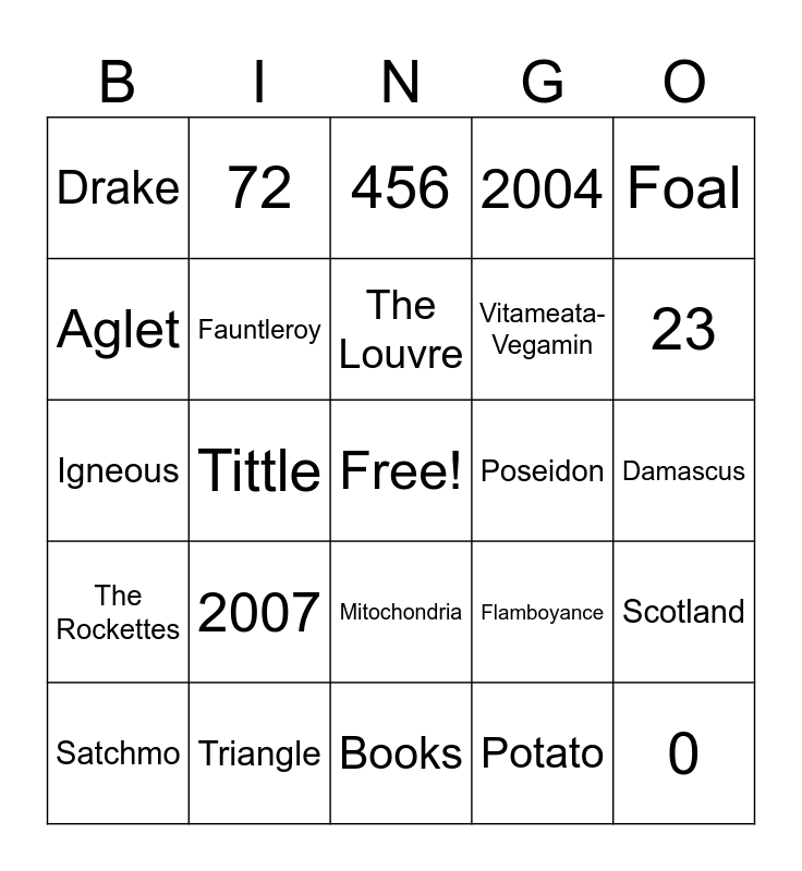 This bingo card has a free space and 24 words: 2007, Triangle, The Louvre, Satchmo, Foal, Drake, Aglet, 72, Poseidon, Mitochondria, Vitameata- Vegamin, Igneous, Flamboyance, Scotland, Fauntleroy, Potato, Damascus, 456, 23, Tittle, 0, The Rockettes, 2004 and Books.