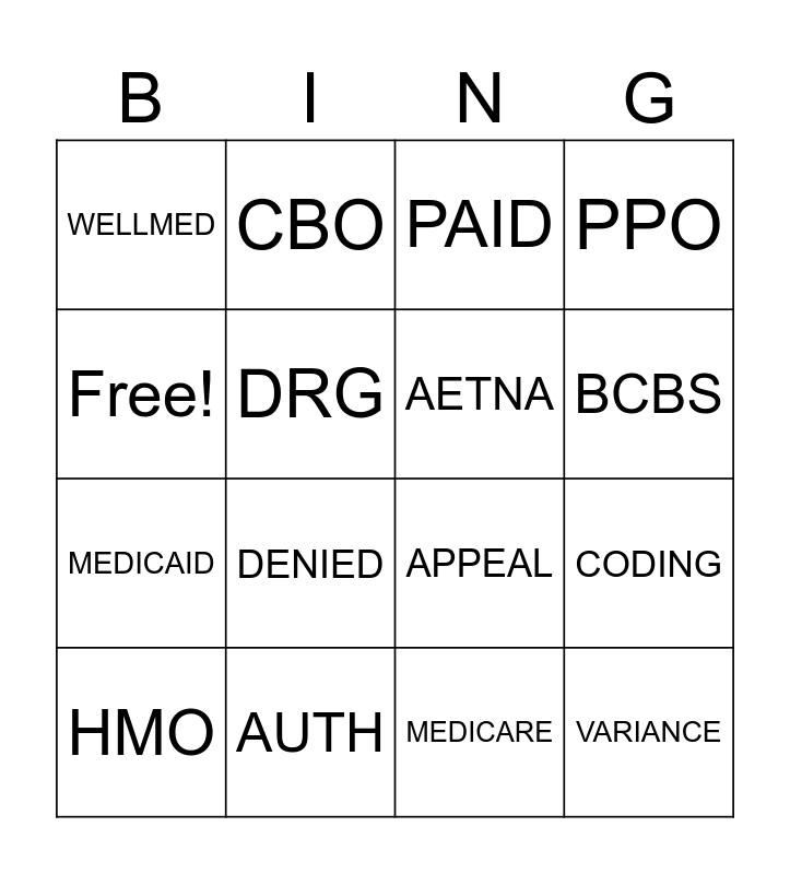 This bingo card has 16 words: AUTH, CODING, PAID, WELLMED, MEDICAID, CBO, APPEAL, MEDICARE, Free!, DRG, HMO, PPO, DENIED, BCBS, AETNA and VARIANCE.