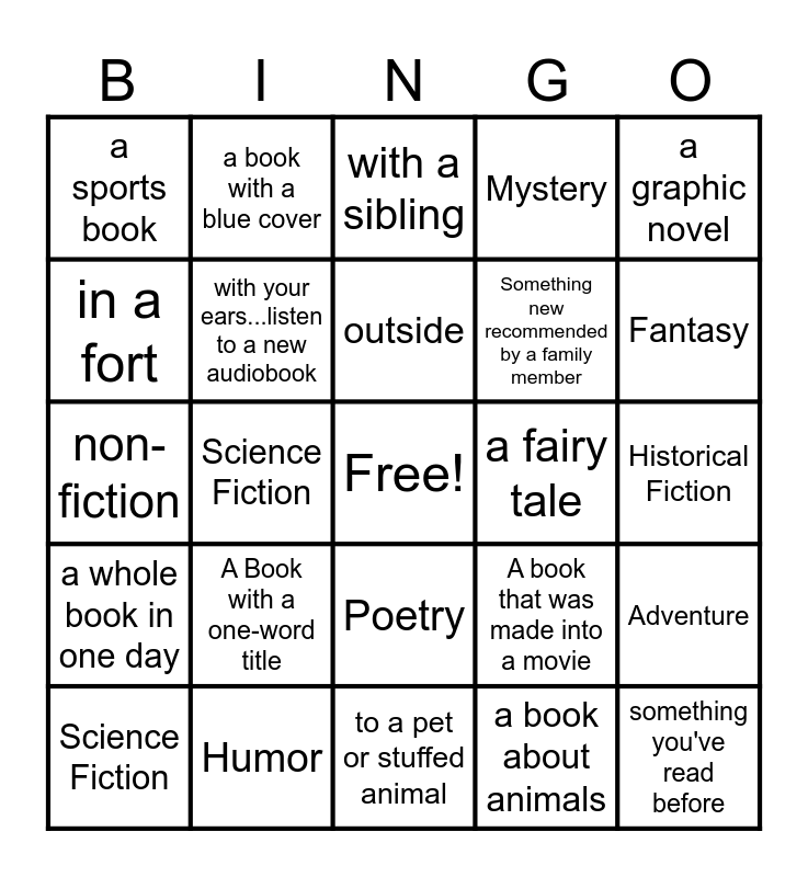 This bingo card has a free space and 24 words: A Book with a one-word title, Humor, outside, Science Fiction, a graphic novel, a sports book, in a fort, a book with a blue cover, a fairy tale, Poetry, Something new recommended by a family member, non-fiction, A book that was made into a movie, Adventure, with your ears...listen to a new audiobook, a book about animals, Historical Fiction, with a sibling, Fantasy, Science Fiction, something you've read before, a whole book in one day, Mystery and to a pet or stuffed animal.