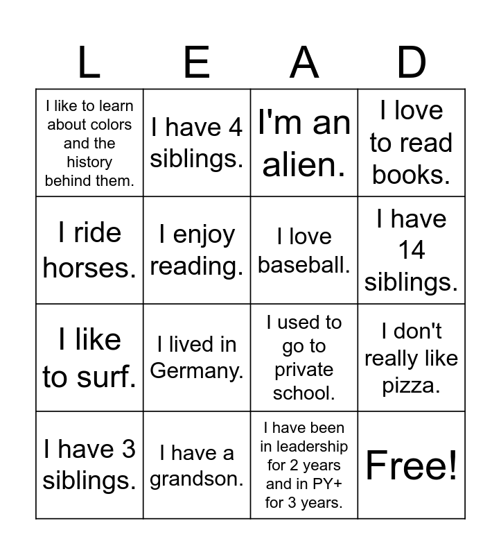 This bingo card has 1 images and 22 words: Free!, I have 14 siblings., I am an only child., I ride horses., I like to learn about colors and the history behind them., I enjoy reading., I have 4 siblings., I have 3 siblings., I LOVE the game uno., I lived in Germany., I like to surf., I told a joke on Wheel of Fortune., I have a dog names Radar., I have a grandson., I had a search party looking for me at the dunes., I'm an alien., I used to go to private school., I love baseball., I don't really like pizza., I love to read books., I have been in leadership for 2 years and in PY+ for 3 years. and I want to become a Marine Biologist..